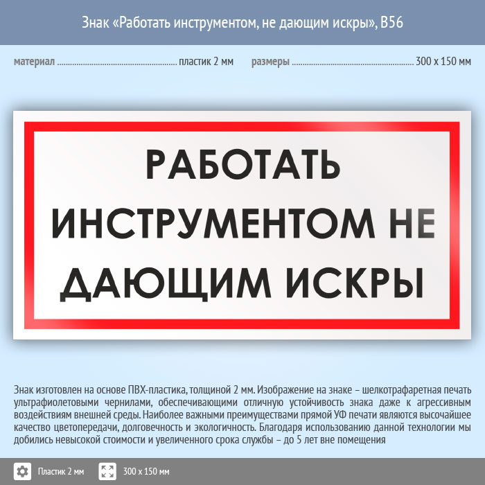 Знак «Работать инструментом, не дающим искры», B56 (пластик, 300х150 мм) в Череповце купить