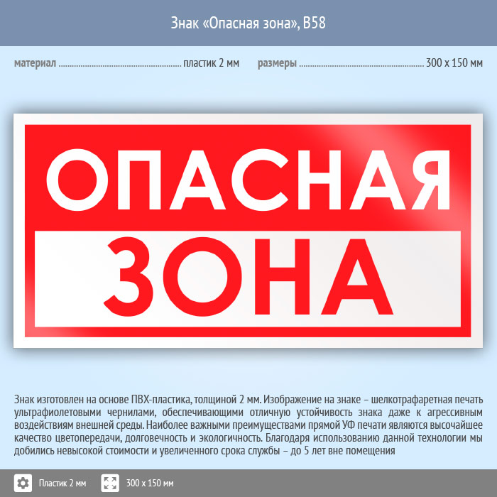 Знак «Опасная зона», B58 (пластик, 300х150 мм) в Череповце купить