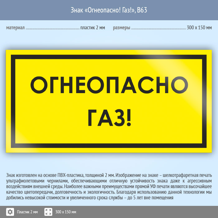 Знак «Огнеопасно! Газ!», B63 (пластик, 300х150 мм) в Череповце купить