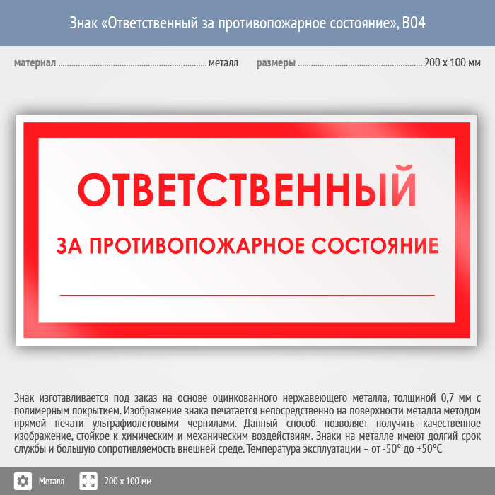 Знак «Ответственный за противопожарное состояние», B04 (металл, 200х100 мм) в Череповце купить