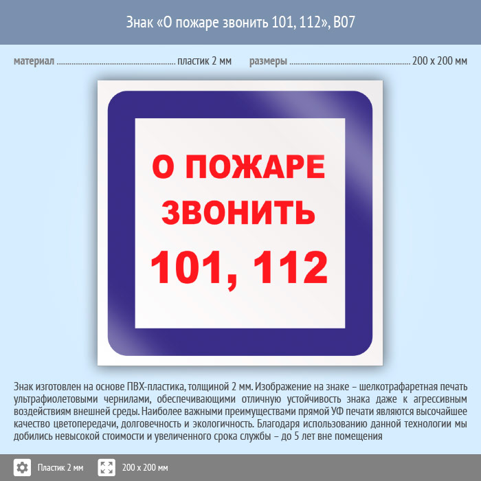 Знак «О пожаре звонить 101, 112», B07 (пластик, 200х200 мм) в Череповце купить