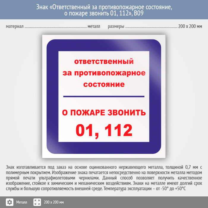 Знак «Ответственный за противопожарное состояние, о пожаре звонить 01, 112», B09 (металл, 200х200 мм) в Череповце купить