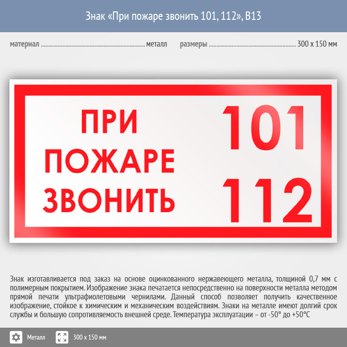 Знак «При пожаре звонить 101, 112», B13 (металл, 300х150 мм) в Череповце купить