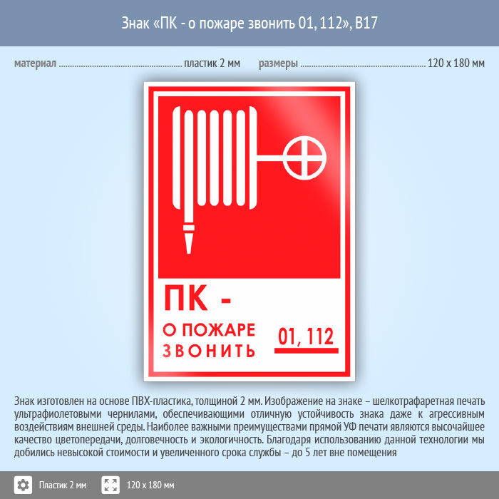 Знак «ПК - о пожаре звонить 01, 112», B17 (пластик, 120х180 мм) в Череповце купить