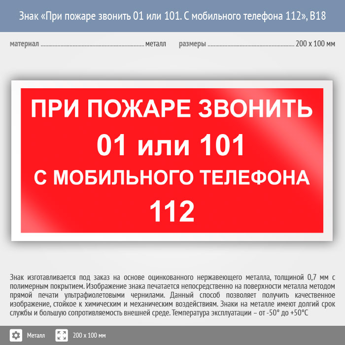 Знак «При пожаре звонить 01 или 101. С мобильного телефона 112», B18 (металл, 200х100 мм) в Череповце купить