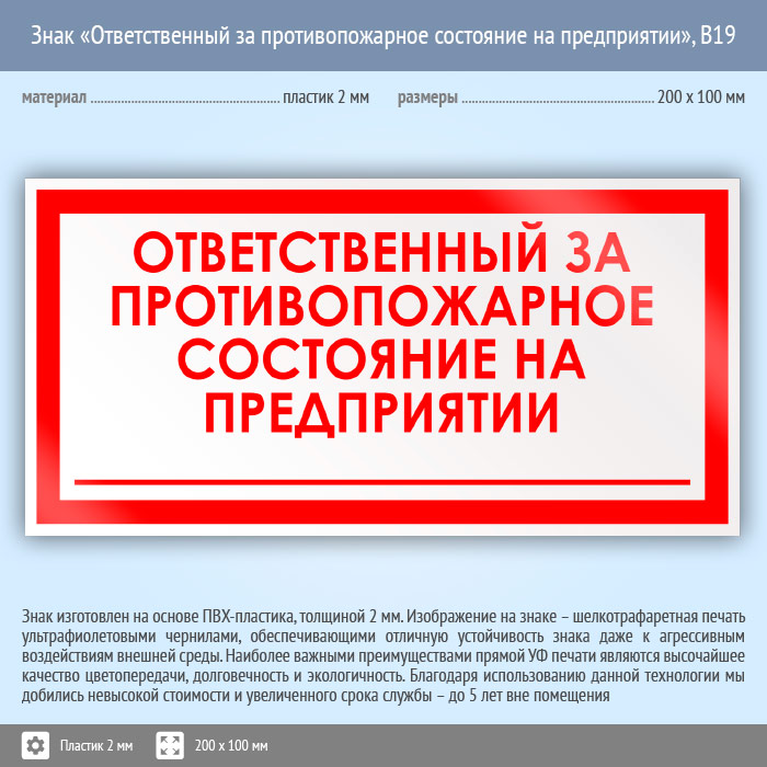 Знак «Ответственный за противопожарное состояние на предприятии», B19 (пластик, 200х100 мм) в Череповце купить