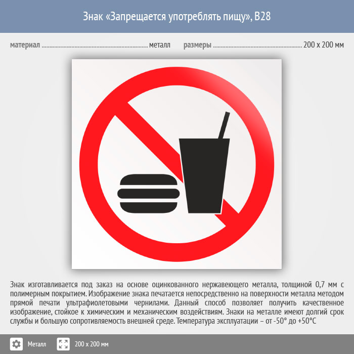 Знак «Запрещается употреблять пищу», B28 (металл, 200х200 мм) в Череповце купить
