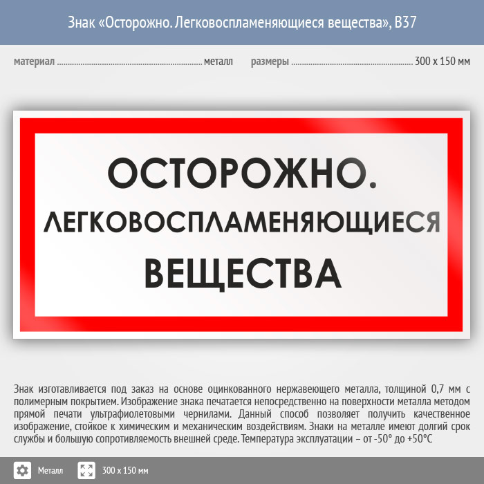 Знак «Осторожно. Легковоспламеняющиеся вещества», B37 (металл, 300х150 мм) в Череповце купить