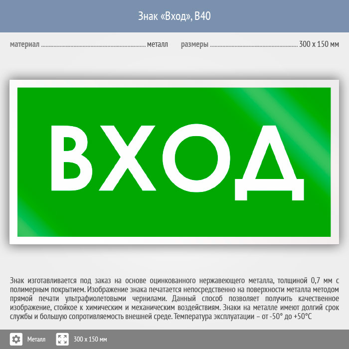 Знак «Вход», B40 (металл, 300х150 мм) в Череповце купить