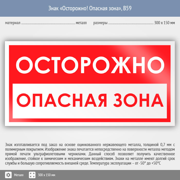 Знак «Осторожно! Опасная зона», B59 (металл, 300х150 мм) в Череповце купить