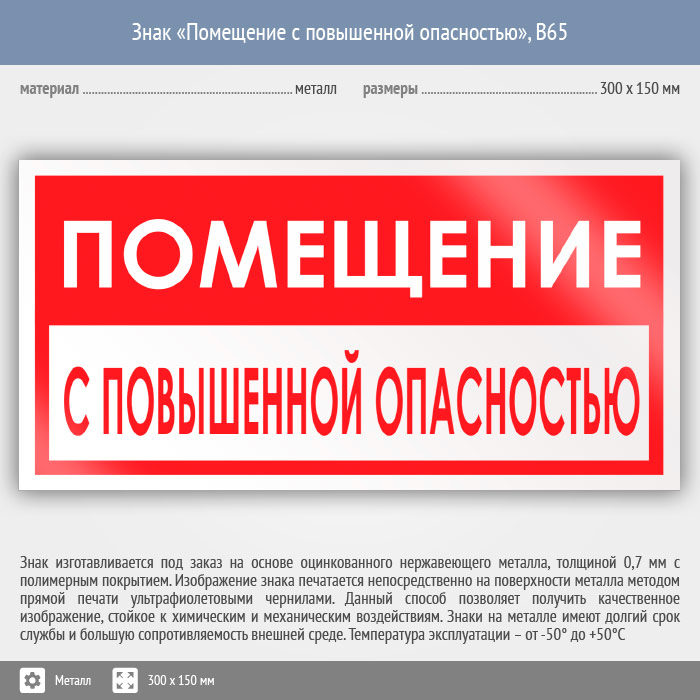 Знак «Помещение с повышенной опасностью», B65 (металл, 300х150 мм) в Череповце купить
