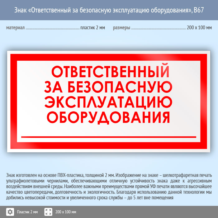 Знак «Ответственный за безопасную эксплуатацию оборудования», B67 (пластик, 200х100 мм) в Череповце купить