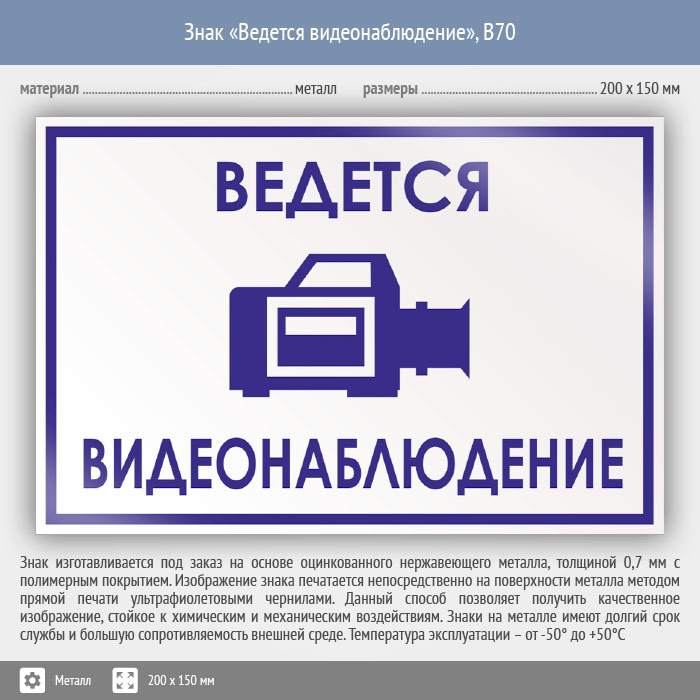 Знак «Ведется видеонаблюдение», B70 (металл, 200х150 мм) в Череповце купить
