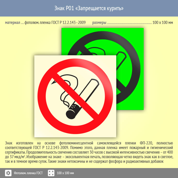 Знак P01 «Запрещается курить» (фотолюминесцентная пленка ГОСТ 34428-2018, 100х100 мм) в Череповце купить