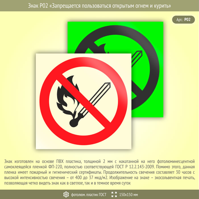 Знак P02 «Запрещается пользоваться открытым огнем и курить» (фотолюминесцентный пластик ГОСТ 34428-2018, 150х150 мм) в Череповце купить