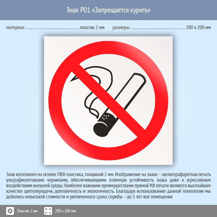 Знак P01 «Запрещается курить» (пластик, 200х200 мм) в Череповце купить