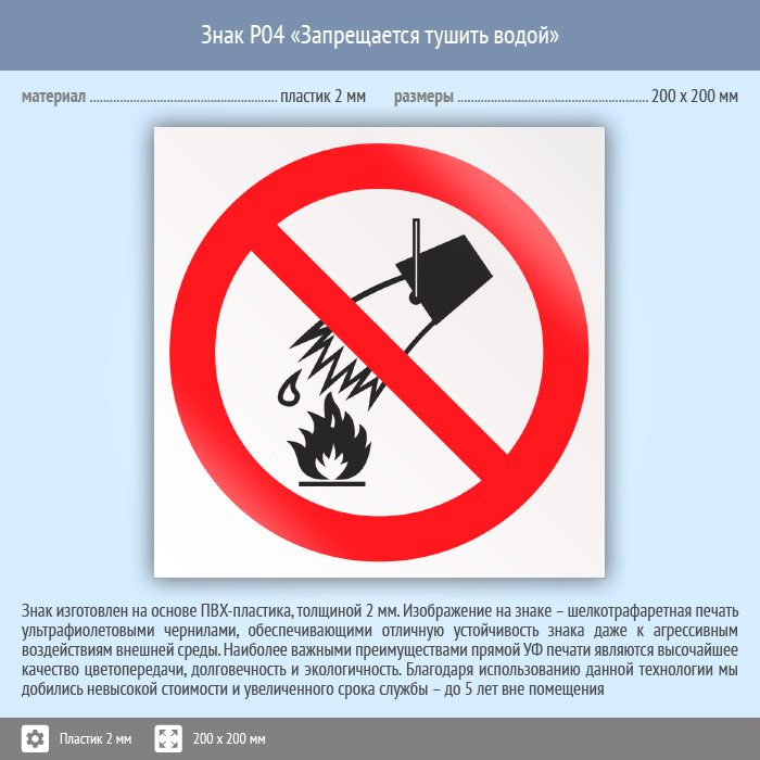 Знак P04 «Запрещается тушить водой» (пластик, 200х200 мм) в Череповце купить