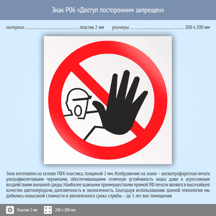 Знак P06 «Доступ посторонним запрещен» (пластик, 200х200 мм) в Череповце купить