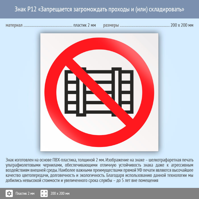 Знак P12 «Запрещается загромождать проходы и (или) складировать» (пластик, 200х200 мм) в Череповце купить