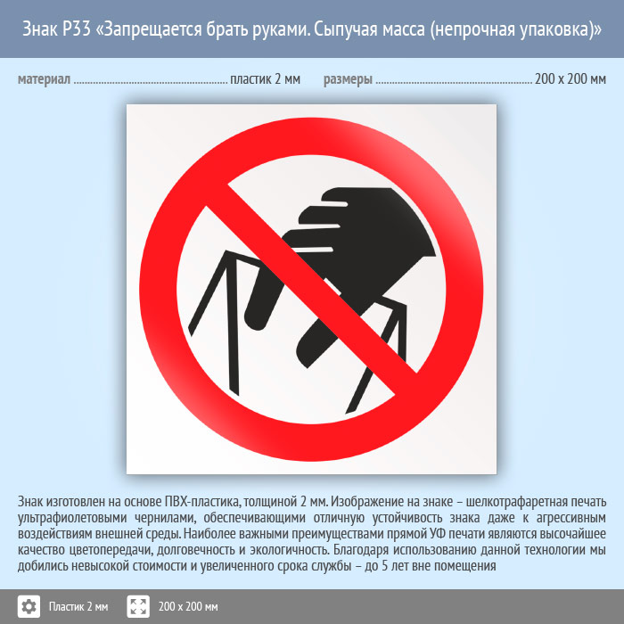 Знак P33 «Запрещается брать руками. Сыпучая масса (непрочная упаковка)» (пластик, 200х200 мм) в Череповце купить