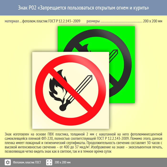 Знак P02 «Запрещается пользоваться открытым огнем и курить» (фотолюминесцентный пластик ГОСТ 34428-2018, 200х200 мм) в Череповце купить
