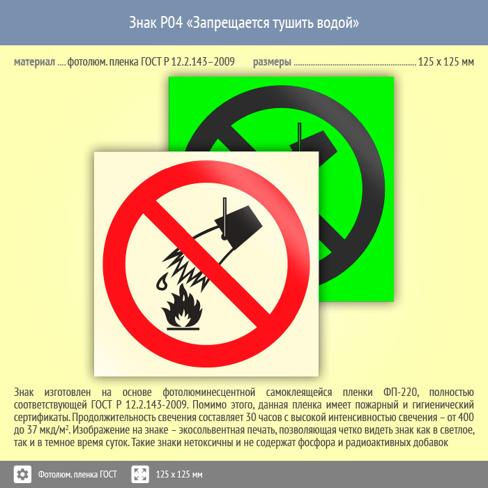 Знак P04 «Запрещается тушить водой» (фотолюминесцентная пленка ГОСТ 34428-2018, 125х125 мм) в Череповце купить