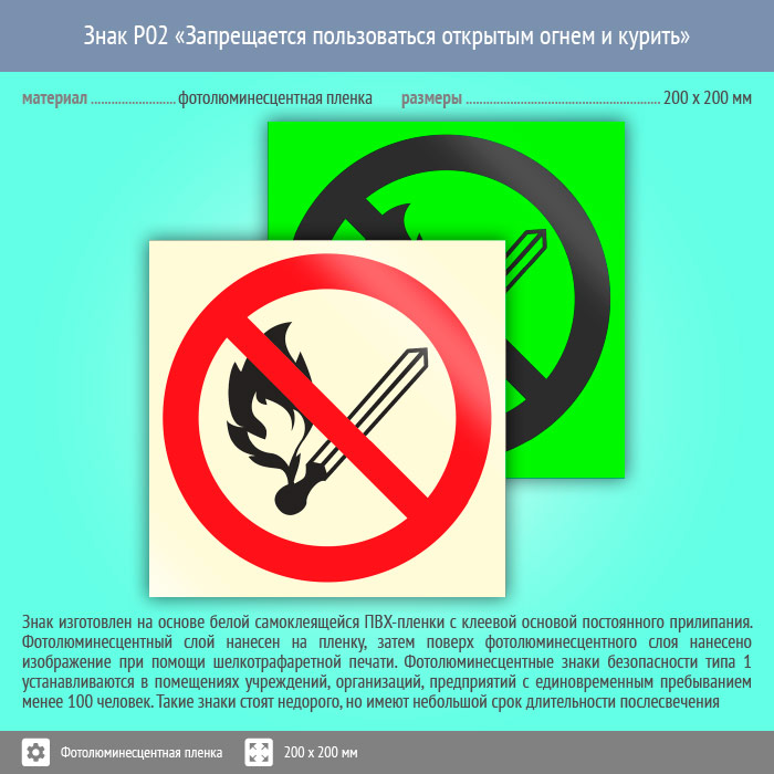 Знак P02 «Запрещается пользоваться открытым огнем и курить» (фотолюминесцентная пленка, 200х200 мм) в Череповце купить