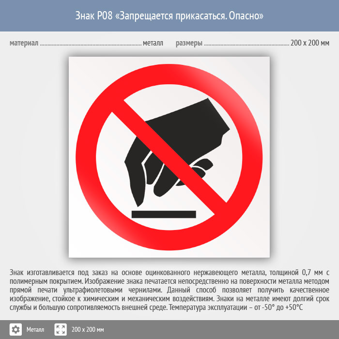 Знак P08 «Запрещается прикасаться. Опасно» (металл, 200х200 мм) в Череповце купить