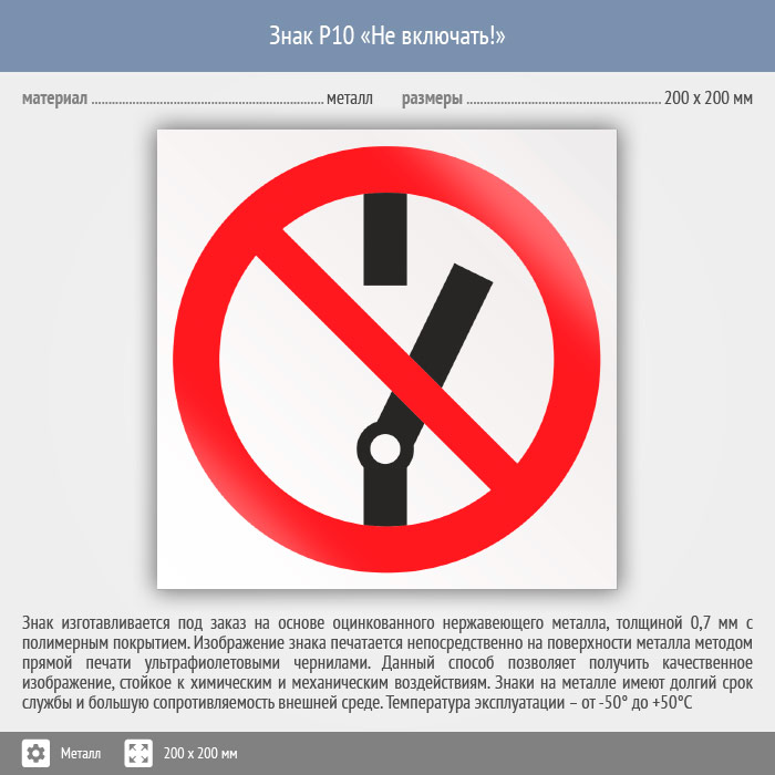 Знак P10 «Не включать!» (металл, 200х200 мм) в Череповце купить