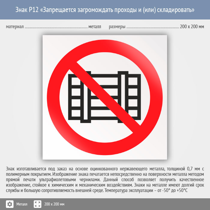Знак P12 «Запрещается загромождать проходы и (или) складировать» (металл, 200х200 мм) в Череповце купить