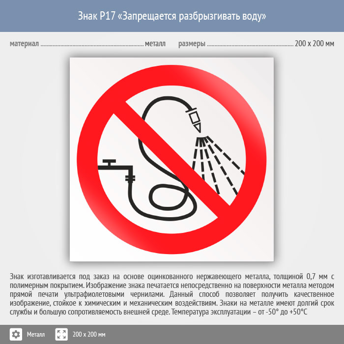 Знак P17 «Запрещается разбрызгивать воду» (металл, 200х200 мм) в Череповце купить