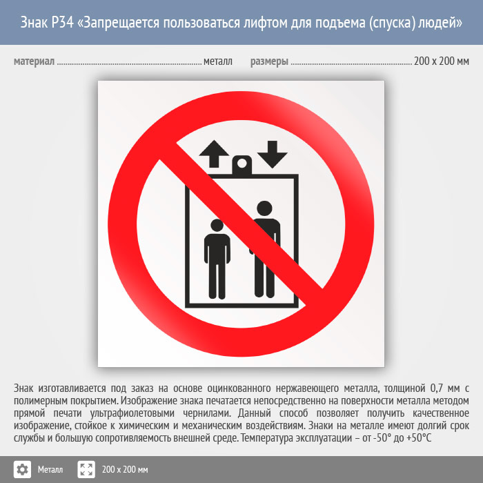 Знак P34 «Запрещается пользоваться лифтом для подъема (спуска) людей» (металл, 200х200 мм) в Череповце купить
