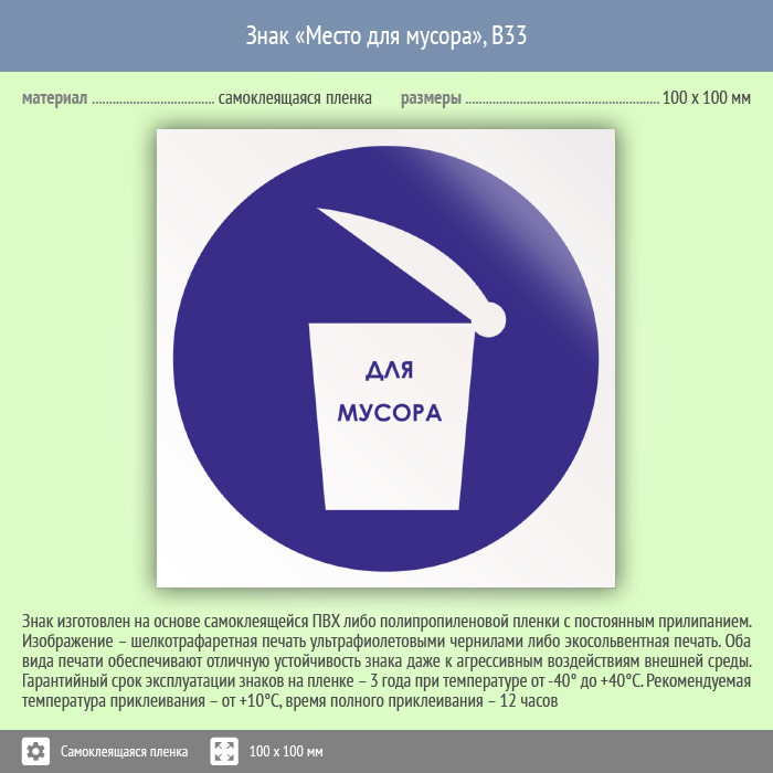 Знак «Место для мусора» может быть изготовлен любого размера на самоклеящейся пленке, пластике толщиной 0.5, 2 или 4 мм и металле. Также возможно применение фотолюминесцентных и световозвращающих материалов