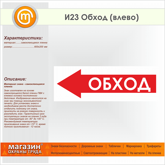 Знак «Обход (влево)», И23 (пленка, 600х200 мм)