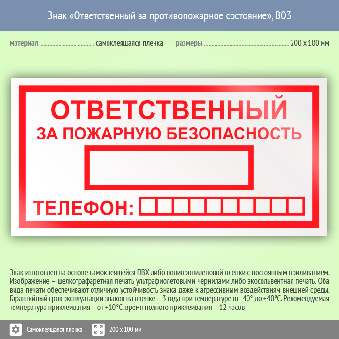 Знак «Ответственный за пожарную безопасность» может быть изготовлен любого размера на самоклеящейся пленке, пластике толщиной 0.5, 2 или 4 мм и металле. Также возможно применение фотолюминесцентных и световозвращающих материалов