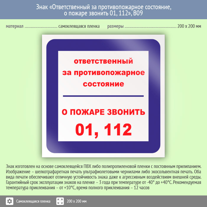 Знак «Ответственный за противопожарное состояние, о пожаре звонить 01, 112», B09