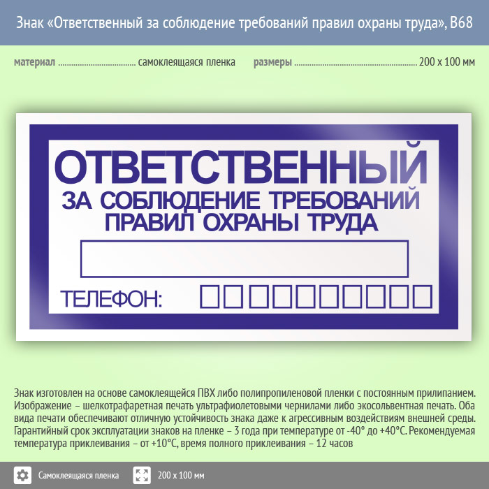 Табличка «Ответственный за соблюдение требований правил охраны труда» информирует об ответственном за соблюдение требований правил охраны труда. Код знака: B68