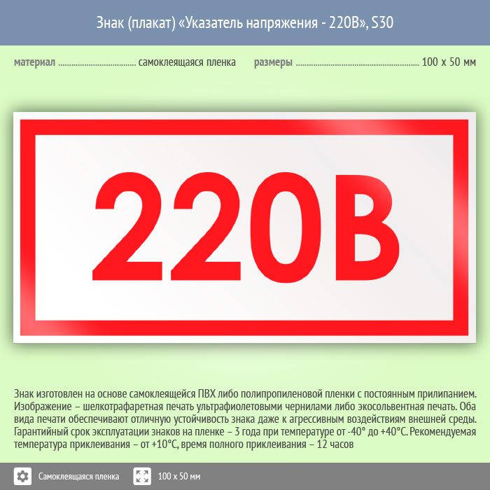 Табличка «Указатель напряжения – 220В» размещают в местах с электрическим напряжением в 220 вольт. Код знака: S30