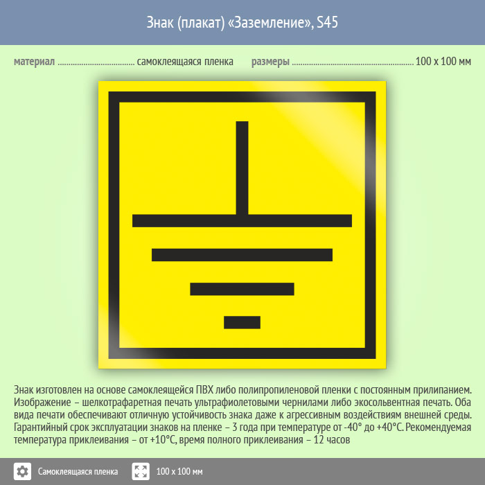 Табличка «Знак заземление» применяется для обозначения мест заземления в электротехнических изделиях и приборах. Код знака: S45