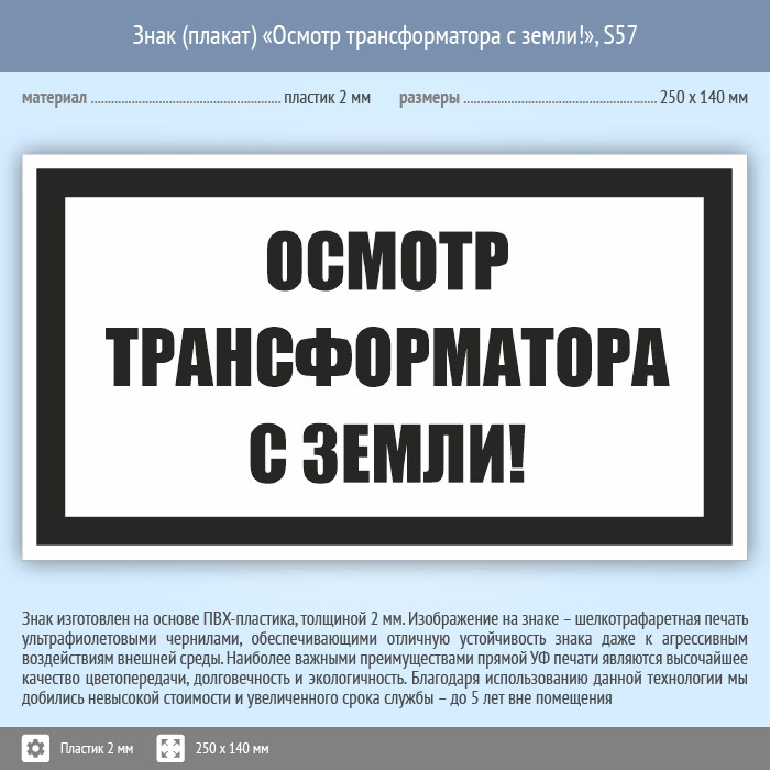 Знак (плакат) «Осмотр трансформатора с земли!», S57 (пластик, 250х140 мм) в Череповце купить