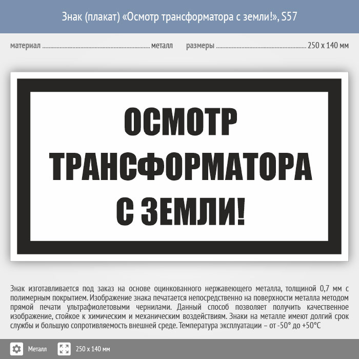 Знак (плакат) «Осмотр трансформатора с земли!», S57 (металл, 250х140 мм) в Череповце купить