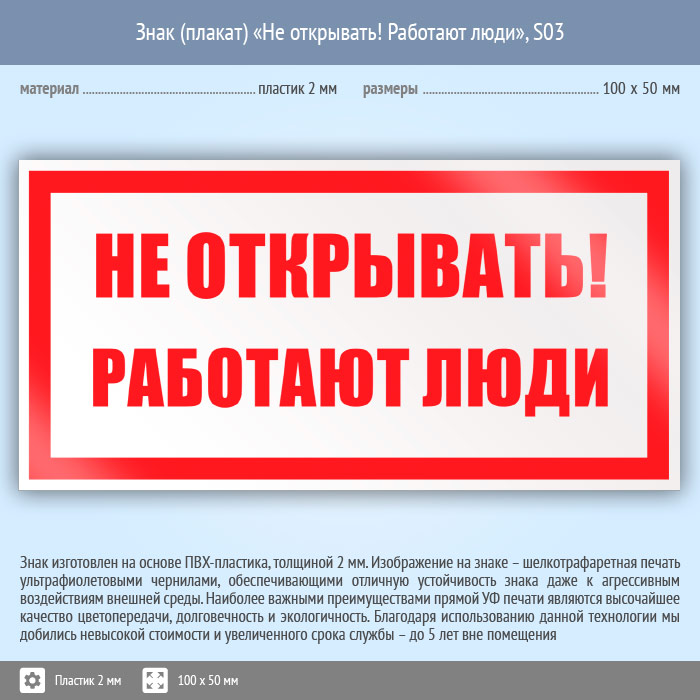 Знак (плакат) «Не открывать! Работают люди», S03 (пластик, 100х50 мм) в Череповце купить