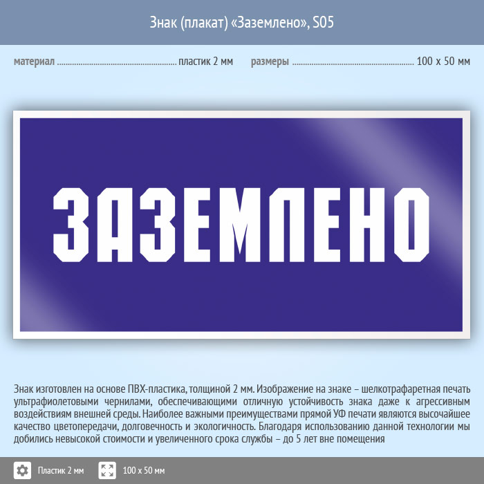 Знак (плакат) «Заземлено», S05 (пластик, 100х50 мм) в Череповце купить