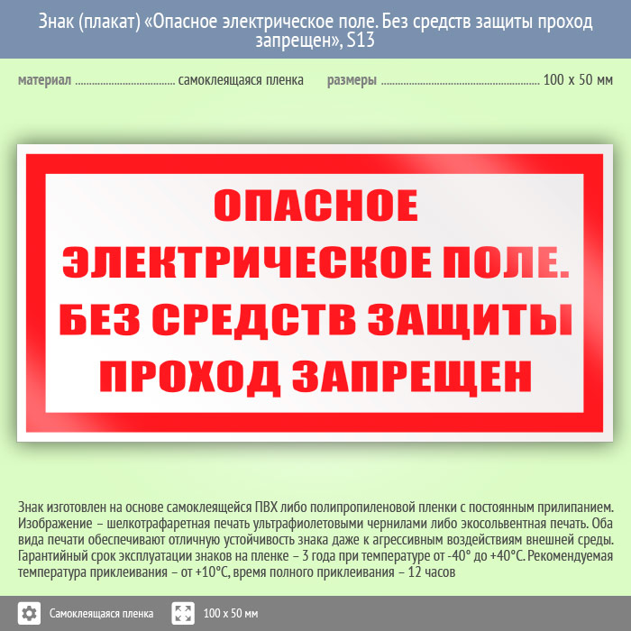Знак (плакат) «Опасное электрическое поле. Без средств защиты проход запрещен», S13 (пленка, 100х50 мм) в Череповце купить