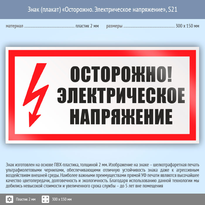 Знак (плакат) «Осторожно. Электрическое напряжение», S21 (пластик, 300х150 мм) в Череповце купить