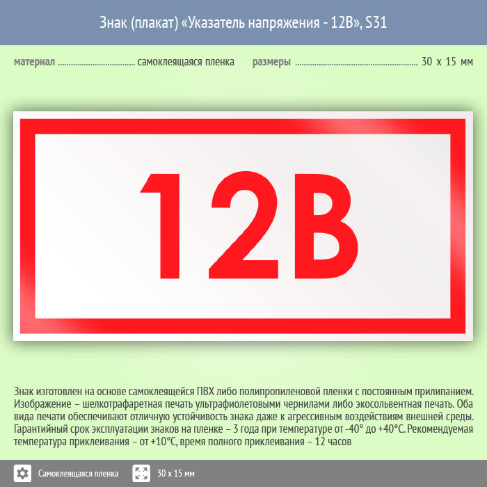 Знак (плакат) «Указатель напряжения 12 В», S31 (50 штук, пленка, 30х15 мм) в Череповце купить