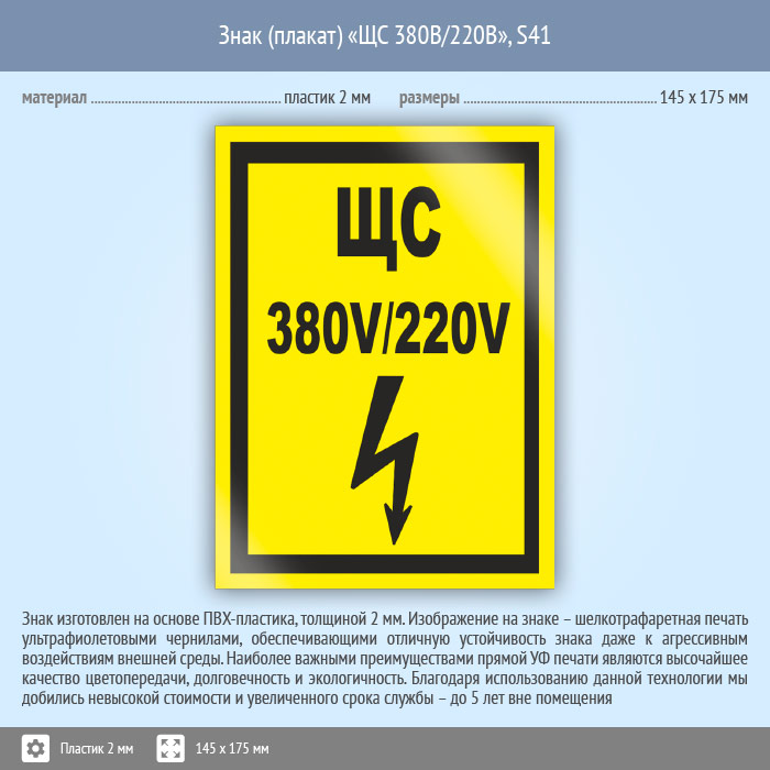 Знак (плакат) «ЩС 380В/220В», S41 (пластик, 145х175 мм) в Череповце купить