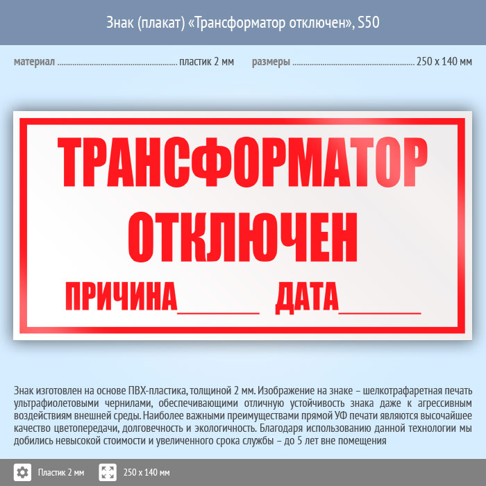 Знак (плакат) «Трансформатор отключен», S50 (пластик, 250х140 мм) в Череповце купить