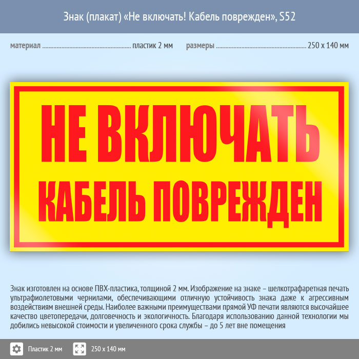 Знак (плакат) «Не включать! Кабель поврежден», S52 (пластик, 250х140 мм) в Череповце купить