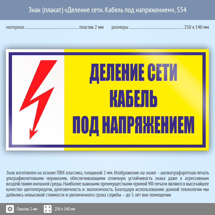 Знак (плакат) «Деление сети. Кабель под напряжением», S54 (пластик, 250х140 мм) в Череповце купить
